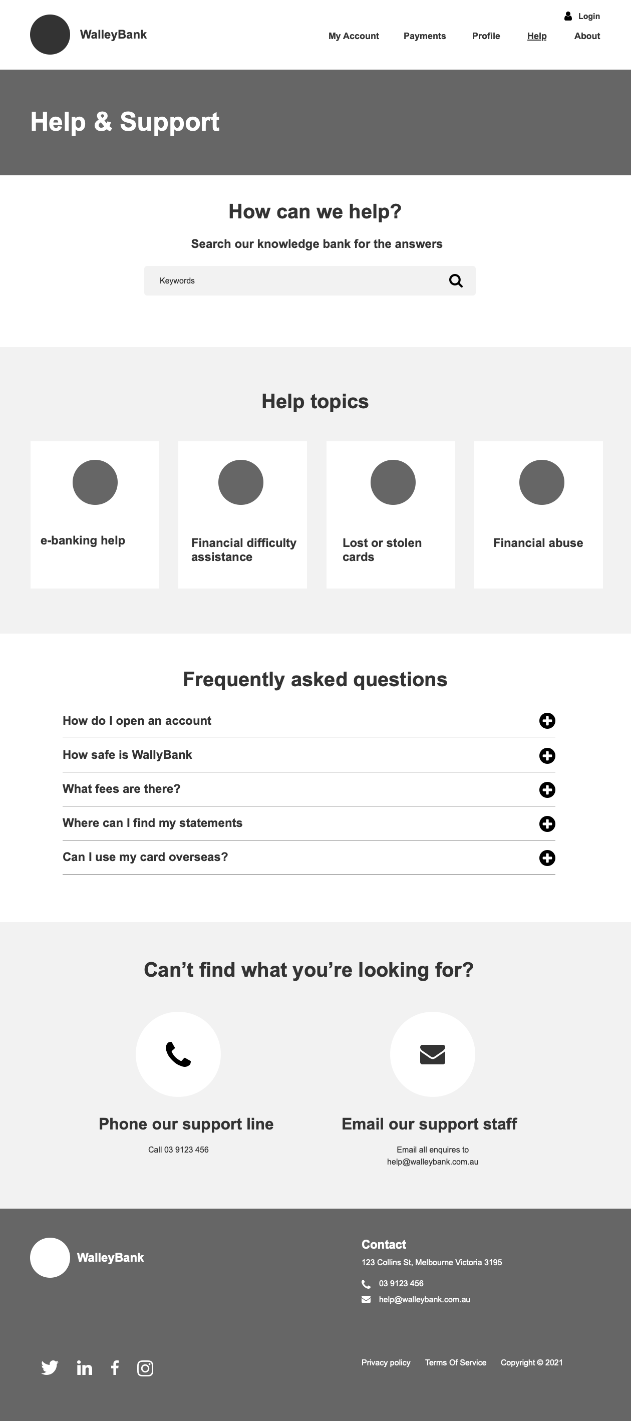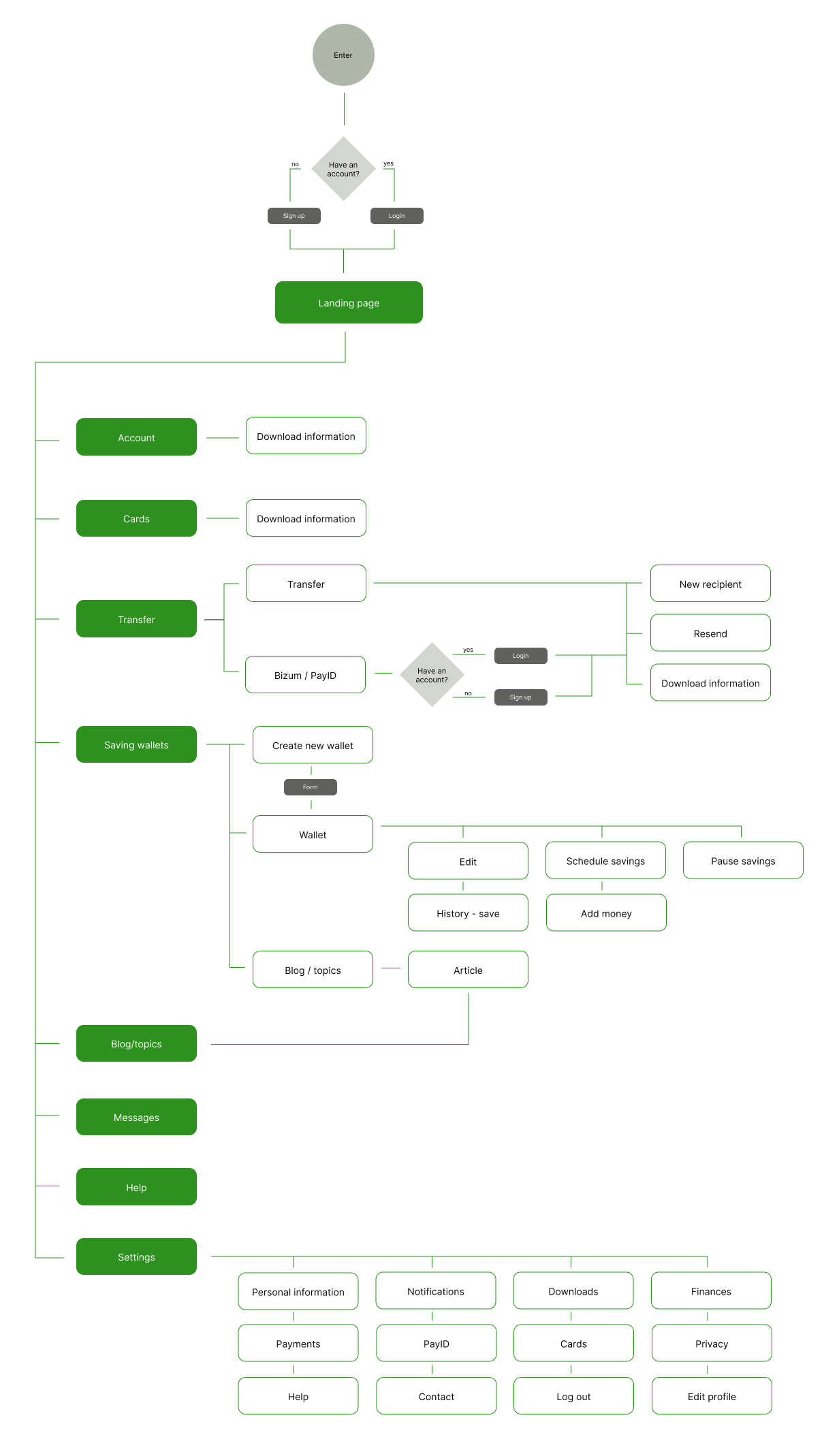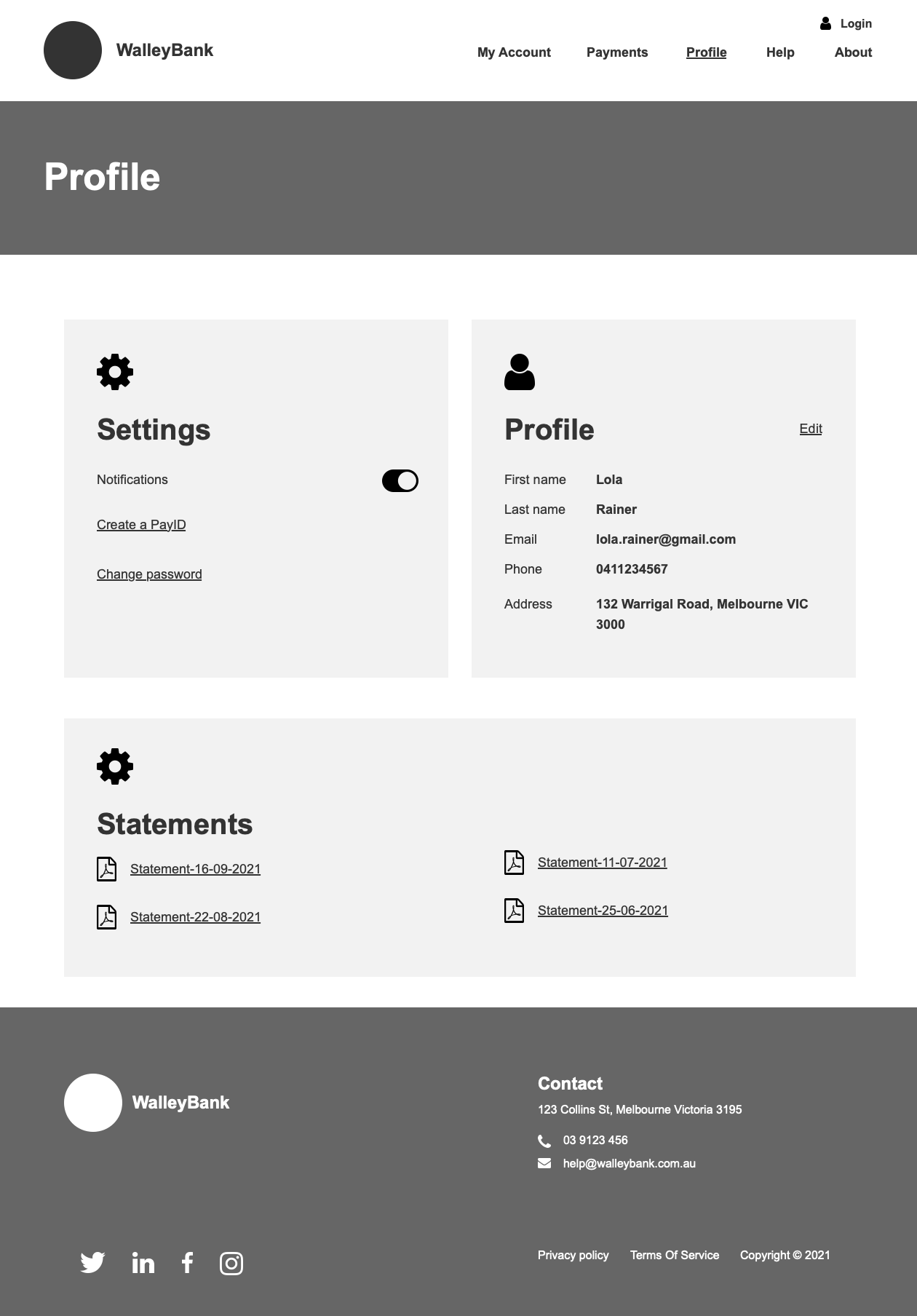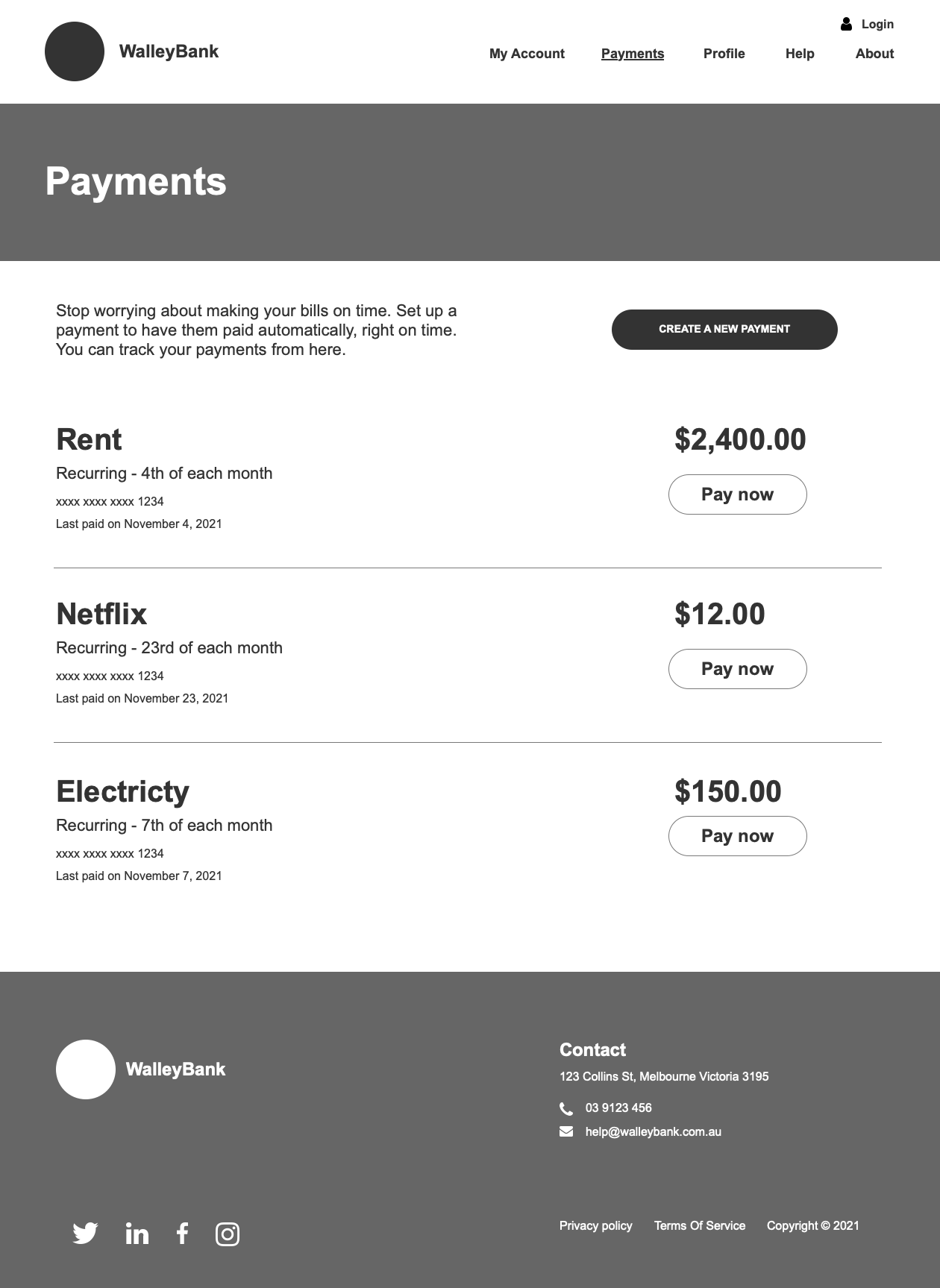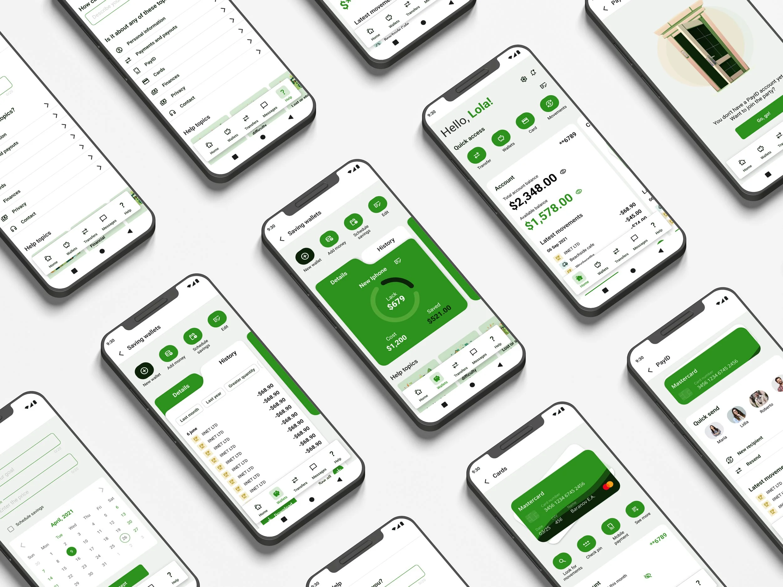 En la primera versión de Wallet Bank (MVP), desarrollé una versión reducida de sus características esenciales con el fin de analizar su alcance. Estos wireframes iniciales incluían: página de inicio, pagos, perfil y ayuda, así como los estados ideales: